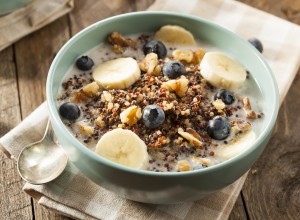 • Breakfast. Cook quinoa only with water (you can add cinnamon, works perfect too). When cooked, you can add some tbs into your yogurt or milk with some fresh fruits as well.